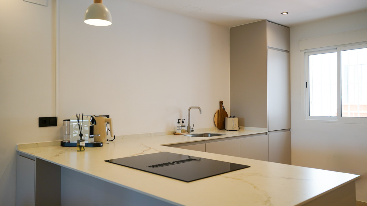 L'appartement dispose de deux chambres spacieuses et de deux salles de bains modernes et élégantes, toutes récemment rénovées selon les normes les plus élevées. Le salon et la salle à manger ouverts s'ouvrent sur une terrasse privée couverte avec vue paisible sur le jardin et la piscine, idéale pour dîner en plein air ou se détendre au soleil. Le double vitrage de haute qualité, la climatisation et un système d'alarme moderne assurent confort et sécurité tout au long de l'année, tandis que les placards intégrés offrent de nombreux rangements.