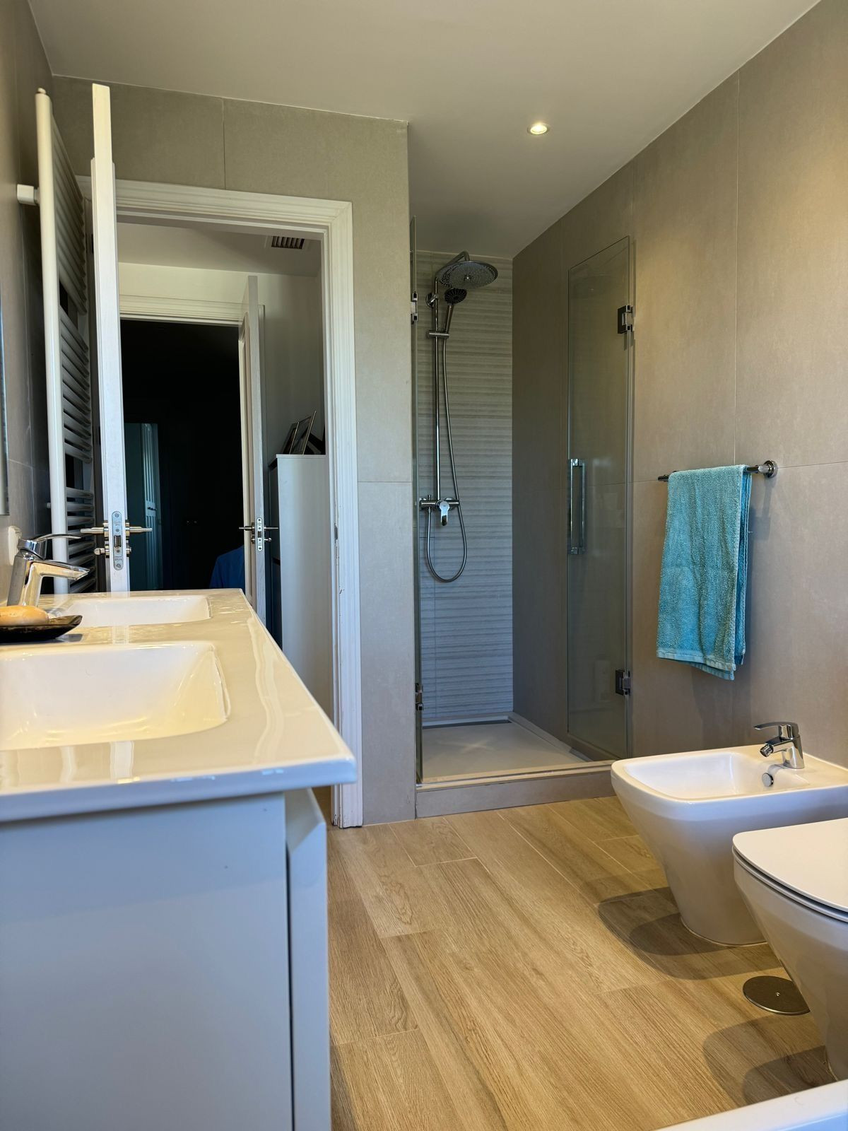 Cette maison de ville s'étend sur trois étages, auxquels s'ajoute une terrasse sur le toit, le tout avec des finitions haut de gamme. Au rez-de-chaussée, vous trouverez un vaste séjour/salle à manger s'ouvrant sur une grande véranda et un jardin privatif, une cuisine entièrement équipée et des toilettes invités. Le premier étage abrite la suite parentale, avec salle de bains privative et terrasse, ainsi que deux chambres supplémentaires, chacune avec son propre balcon, partageant une salle de bains. La terrasse sur le toit est un véritable atout, offrant un barbecue intégré et une vue imprenable sur la mer.