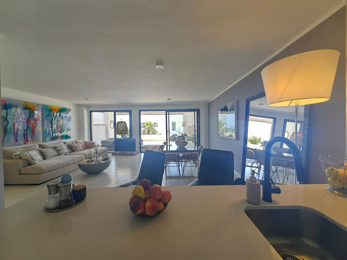 Le séjour lumineux et ouvert s'ouvre sur une grande terrasse semi-couverte exposée plein sud avec vue partielle sur la mer, créant ainsi un cadre idéal pour profiter du soleil de la Costa del Sol tout au long de la journée. À l'arrière, un jardin privé avec terrasse en bois offre un havre de paix, idéal pour les repas en plein air, les barbecues ou tout simplement pour se détendre.
