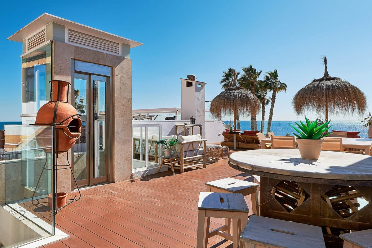 Cet élégant immeuble abrite trois appartements touristiques haut de gamme, équipés d'un ascenseur, ainsi qu'un bar sophistiqué sur le toit offrant une vue sur la mer.
