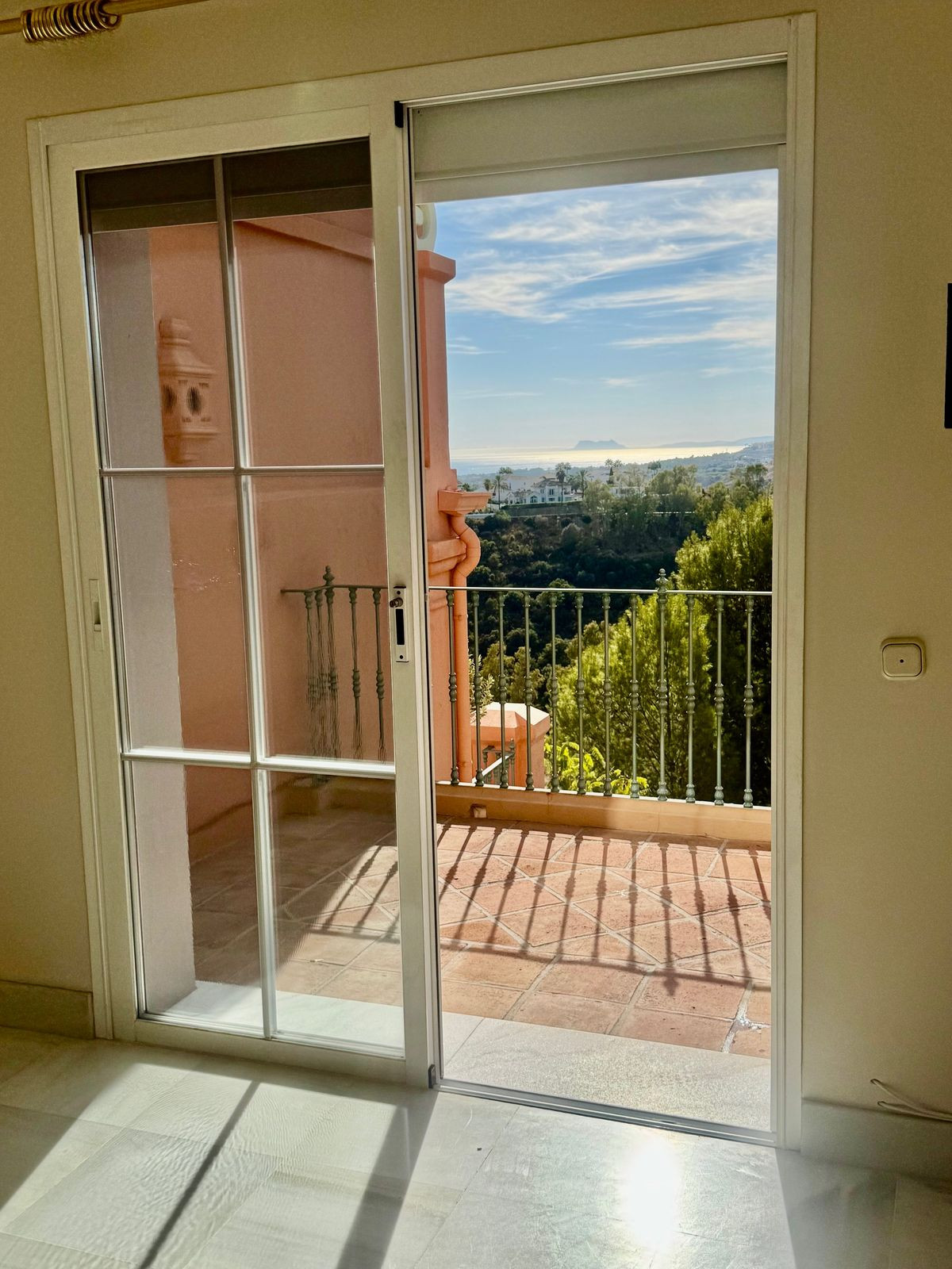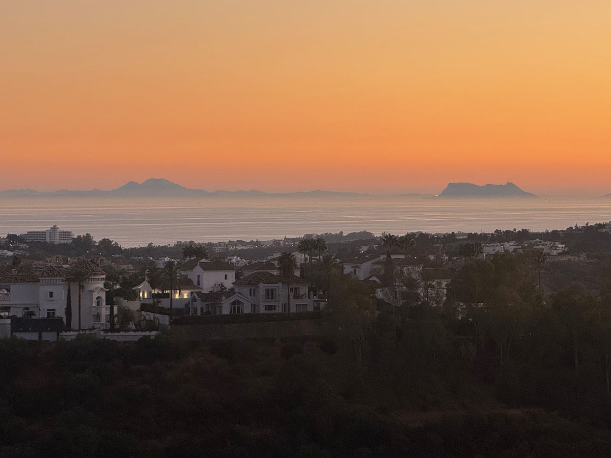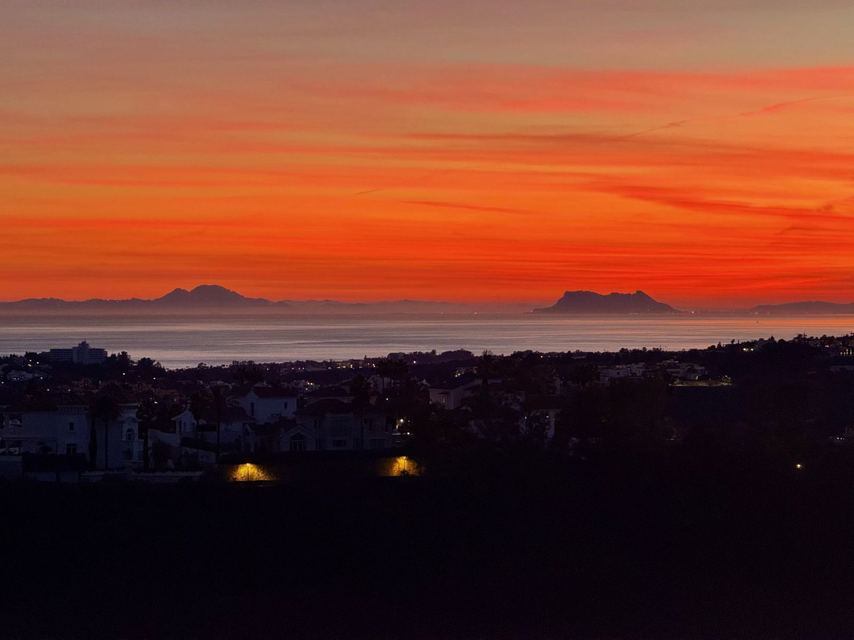 En approchant de l'entrée, quelques marches mènent à la porte principale. Une fois à l'intérieur, vous découvrirez un espace de vie et salle à manger spacieux et lumineux, baigné de lumière grâce à ses baies vitrées qui créent une atmosphère chaleureuse. Accédez ensuite à votre vaste terrasse couverte de 22 m², équipée de rideaux de verre, qui vous permettra d'admirer la vue panoramique imprenable sur Benahavís, les majestueuses montagnes environnantes, l'emblématique Rocher de Gibraltar et la mer scintillante. La magnifique vue dégagée au sud-ouest procure une sensation de bien-être tout au long de l'année ; par temps clair, vous pourrez même apercevoir la côte africaine et les montagnes de l'Atlas – un spectacle à couper le souffle ! Les couchers de soleil y sont tout simplement spectaculaires.