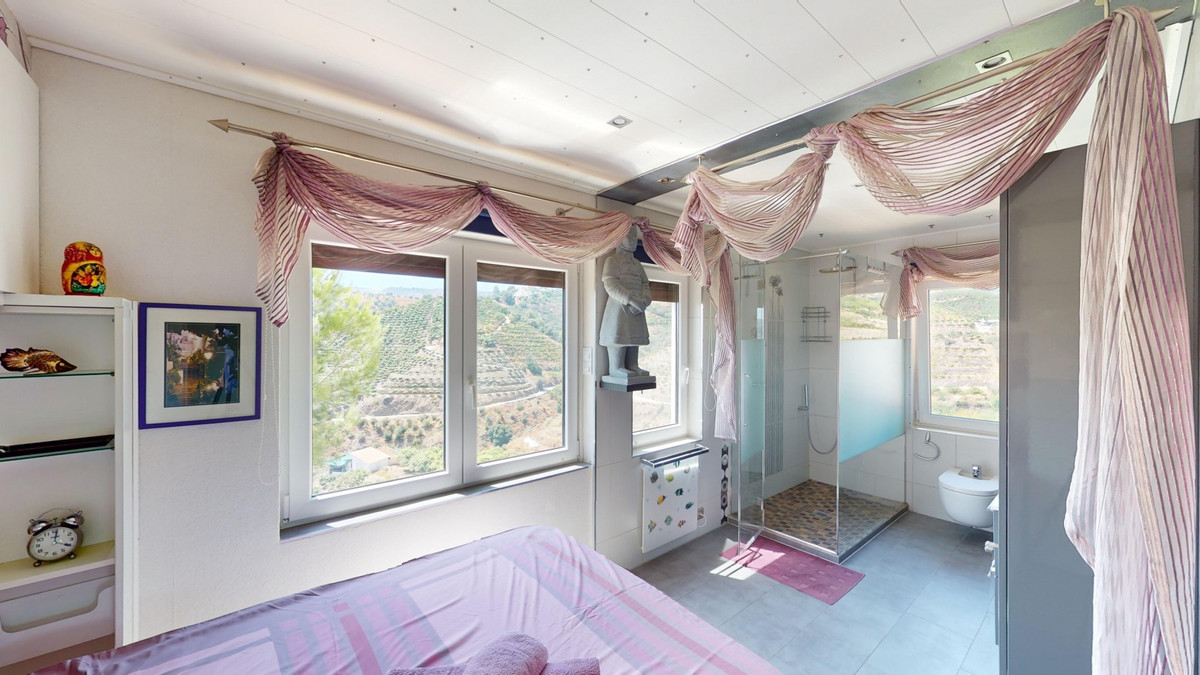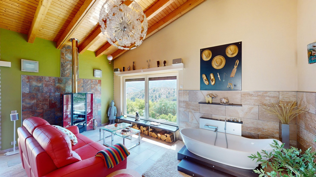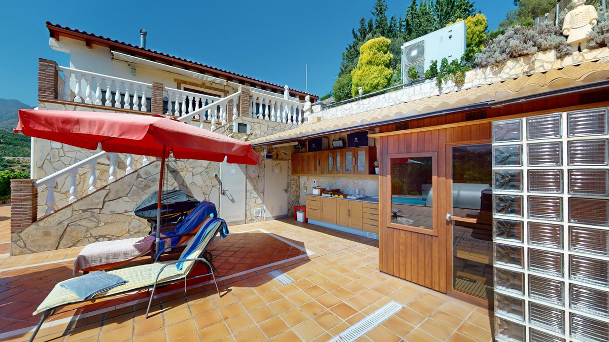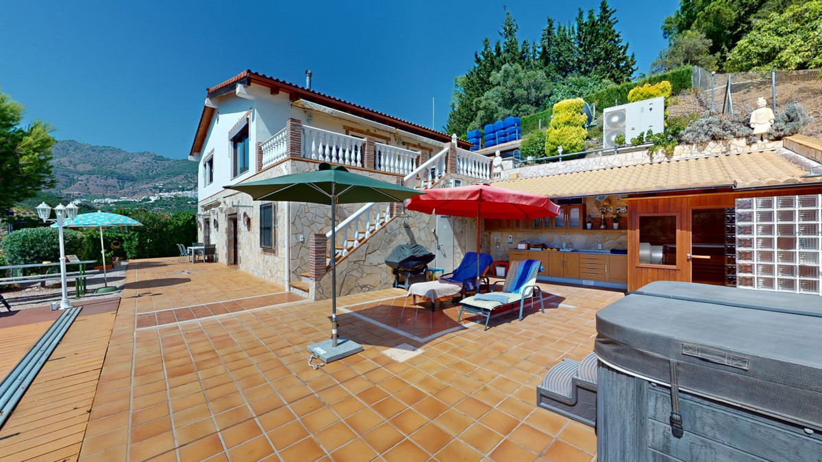 Magnifique villa à vendre au pied de Frigiliana. Cette impressionnante villa, nichée au pied de Frigiliana, offre deux logements indépendants sur deux niveaux, chacun avec son propre accès et son intimité. Le logement supérieur, d'une superficie de 150 m², comprend un vaste espace de vie ouvert avec cuisine attenante et rangements pratiques. La terrasse offre une vue imprenable sur les montagnes environnantes. Le salon se distingue par sa cheminée pivotante, qui apporte chaleur et ambiance. La terrasse abrite également une salle de fitness. Autre atout : la luxueuse baignoire du salon, idéale pour se détendre. Ce logement comprend trois chambres spacieuses, deux salles de bains (dont une attenante à la chambre principale) et des toilettes invités. Le logement inférieur, d'une superficie totale de 80 m², comprend un espace de vie convivial avec cuisine, une chambre et une salle de bains. L'ensemble de la maison est équipé d'un chauffage au sol, de la climatisation et d'un système d'aspiration centralisée. Construite selon les normes allemandes les plus exigeantes, elle bénéficie d'une excellente isolation et de matériaux de haute qualité. Un système de panneaux solaires sur le toit assure le chauffage et l'eau chaude sanitaire. L'espace extérieur de cette villa d'exception est tout simplement parfait. Vous y trouverez une piscine d'eau salée chauffée avec une couverture facile à manipuler, un jacuzzi relaxant et une cuisine d'été entièrement équipée avec sauna. De plus, un atelier, une caravane et une petite dépendance se situent au pied de la propriété. Le terrain de 6 000 m² est agrémenté de nombreux arbres fruitiers, une véritable invitation à la flânerie pour les amoureux de la nature. La villa bénéficie d'une excellente desserte et est idéale pour ceux qui apprécient une vie paisible en pleine nature. Vivez une expérience luxueuse dans un cadre à couper le souffle : votre nouvelle demeure au pied de Frigiliana vous attend ! Nous serons ravis de vous présenter prochainement cette propriété de rêve, en personne ou par visite virtuelle. Car ce monde est unique, à l'image de notre Axarquía. En Andalousie. Sur la Costa del Sol. Ici, sous le soleil…