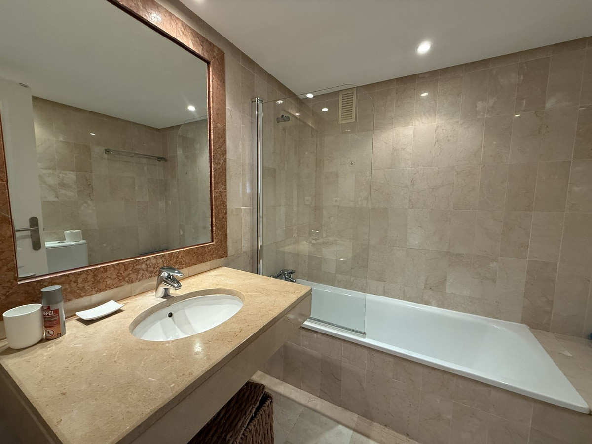 The apartment features a large south-facing terrace of 35 m², bathed in sunlight throughout the day, a wonderful space to relax, dine, or enjoy the peaceful surroundings. The kitchen is well equipped and can easily be transformed into an open-plan design to create a more modern flow with the living area. Both bedrooms are spacious and bright, offering plenty of storage and privacy.