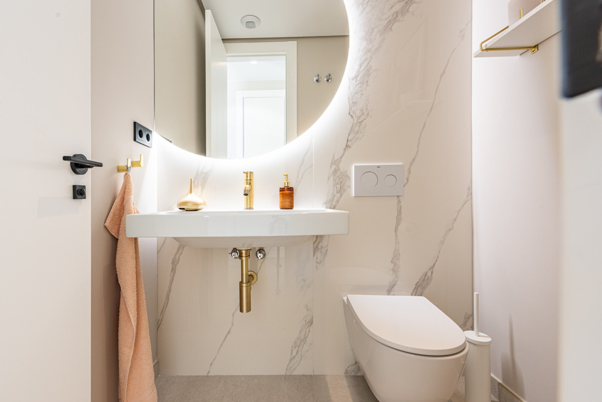 Le rez-de-chaussée comprend un salon spacieux et une cuisine américaine design avec des baies vitrées offrant une vue imprenable sur les montagnes. De là, les espaces de vie s'ouvrent naturellement sur un jardin paysager soigné et une piscine à débordement d'eau salée chauffée. Ce niveau abrite également une suite d'invités généreuse avec salle de bains privative, ainsi que des toilettes invités élégantes.