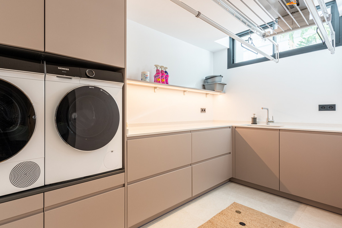 Le rez-de-chaussée offre de vastes espaces supplémentaires, comprenant des pièces de rangement, une buanderie, un local technique et un grand garage pouvant accueillir plus de quatre voitures. Ce niveau offre également de nombreuses possibilités d'aménagement : transformer une partie de l'espace en salle de cinéma, salle de sport, cave à vin ou même appartement d'invités indépendant.