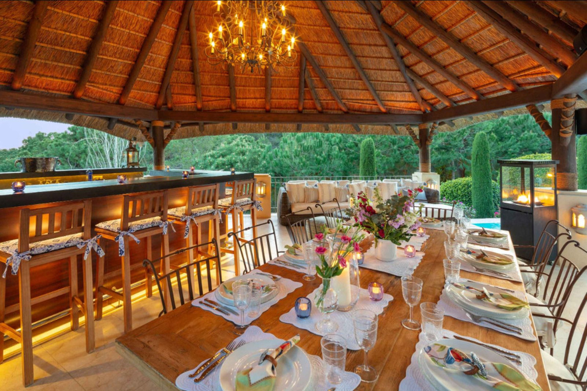 À l'extérieur, des jardins impeccablement entretenus entourent une grande piscine privée, idéale pour profiter du climat de la Costa del Sol. La propriété comprend également un garage, un cellier et toutes les commodités nécessaires à un confort haut de gamme.