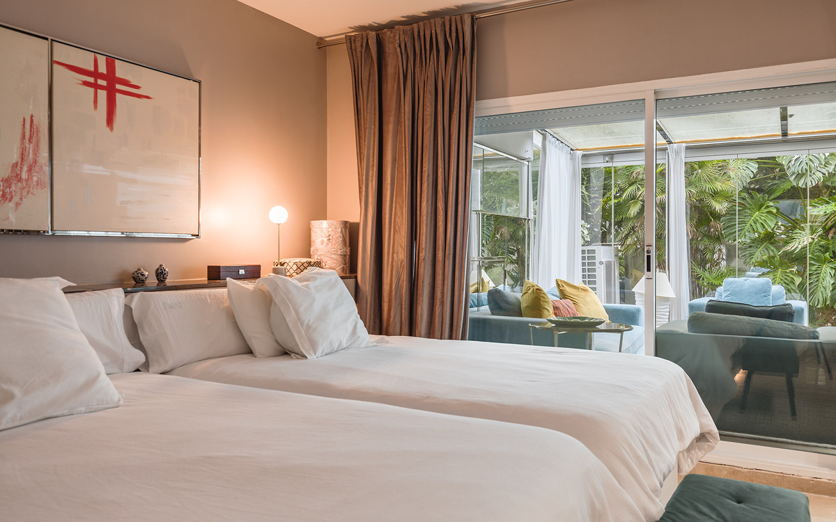 Magnifique appartement de plain-pied situé dans une résidence sécurisée 24h/24 du club Las Lomas del Marbella, au cœur du Golden Mile. Entièrement rénové, il offre un agencement ouvert exceptionnel, fusionnant harmonieusement cuisine, séjour et vaste terrasse. De grandes baies vitrées s'ouvrent du séjour sur un jardin tropical luxuriant et une terrasse couverte, équipée de rideaux de verre ajustables. Ces rideaux peuvent être ouverts en été pour créer un espace de réception convivial et intime. L'appartement optimise sa surface et comprend deux chambres spacieuses, chacune avec sa propre salle de bains. La chambre principale s'ouvre sur la grande terrasse située à l'arrière de l'appartement. La résidence propose une piscine extérieure avec vue imprenable sur la mer, une salle de sport et un sauna. Un emplacement de parking et un grand cellier sont inclus. Situé dans un quartier très prisé, à mi-chemin entre Marbella et Puerto Banús.
