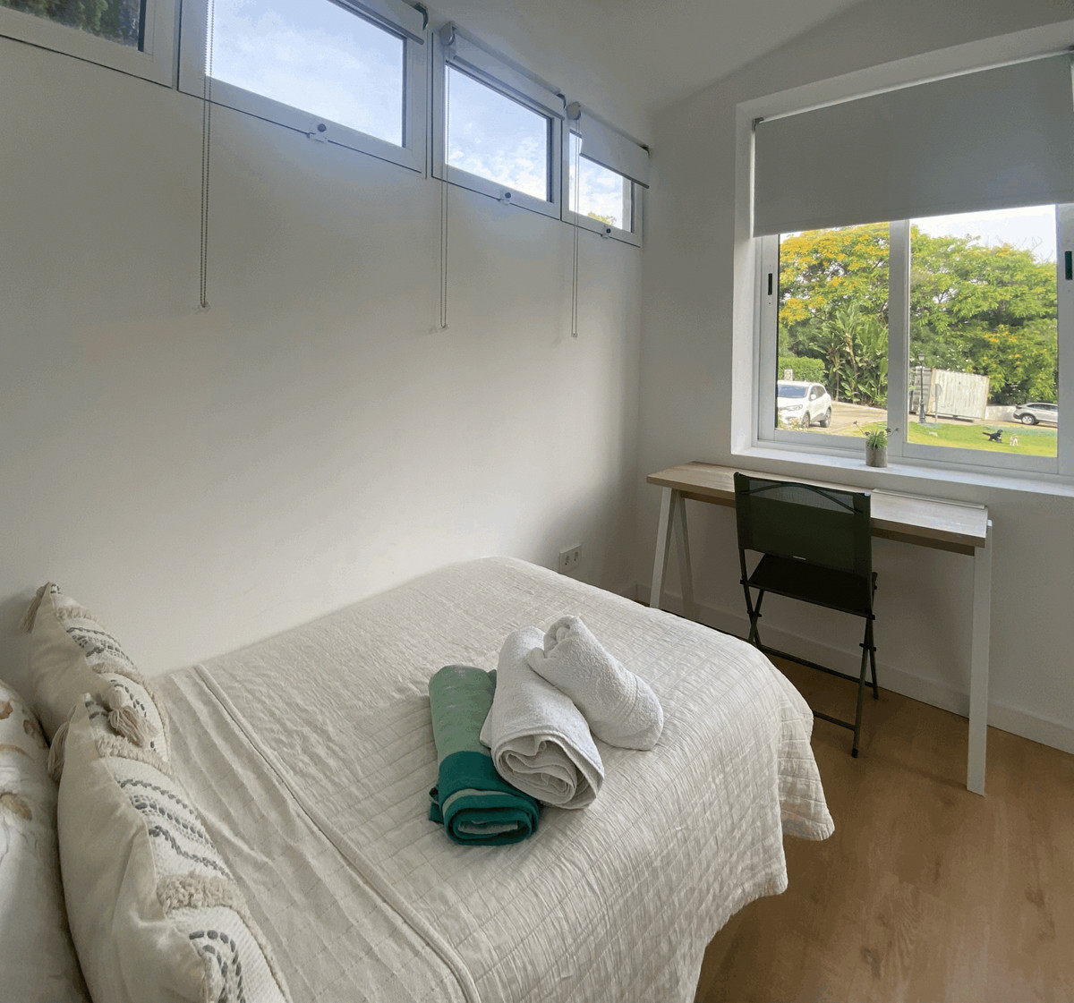D'une superficie totale de 60 m², il comprend 2 chambres, 1 salle de bains, une cuisine entièrement équipée et un salon lumineux donnant sur une terrasse surplombant les jardins communs.
