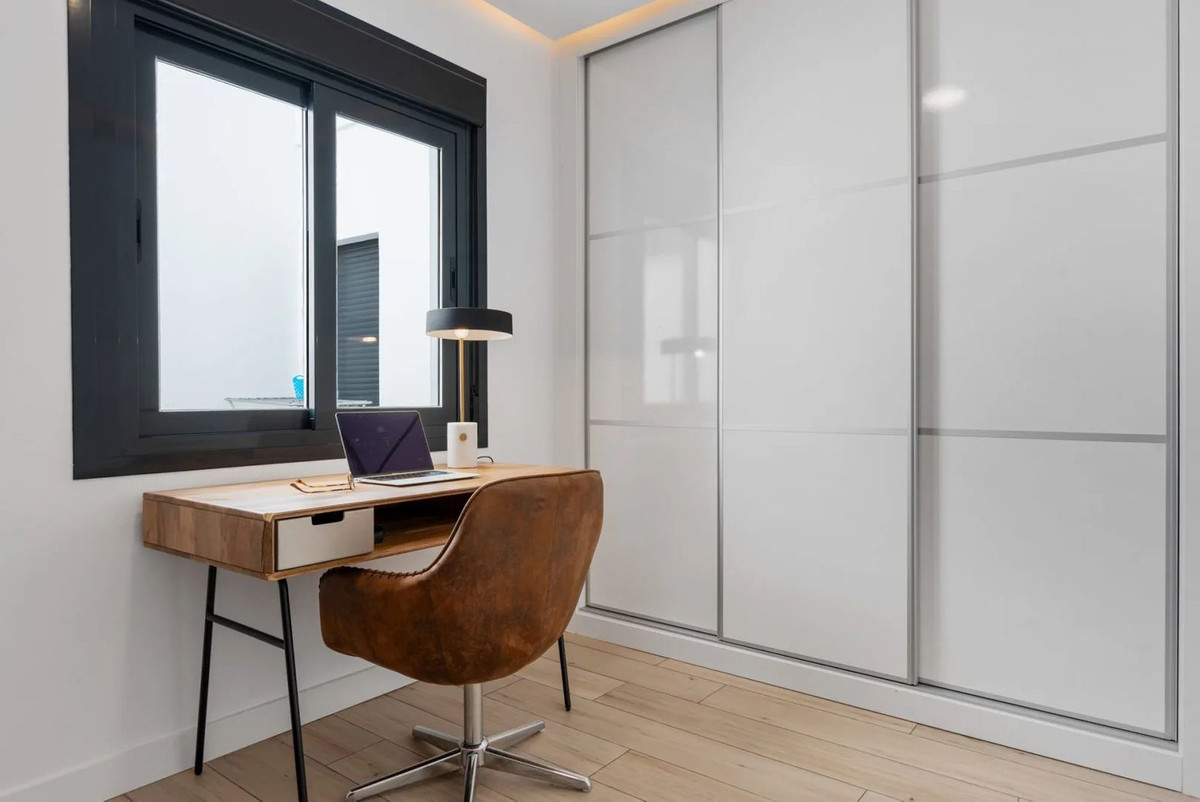 Ce logement comprend deux chambres et deux salles de bains. La spacieuse chambre principale dispose de grands placards intégrés et d'une salle de bains privative avec douche à l'italienne, WC et lavabo. La seconde chambre est aménagée avec goût en espace bureau grâce à un canapé-lit – idéal pour accueillir des invités ou pour le télétravail. La seconde salle de bains, également moderne, est équipée d'une douche à l'italienne, de WC et d'un lavabo.