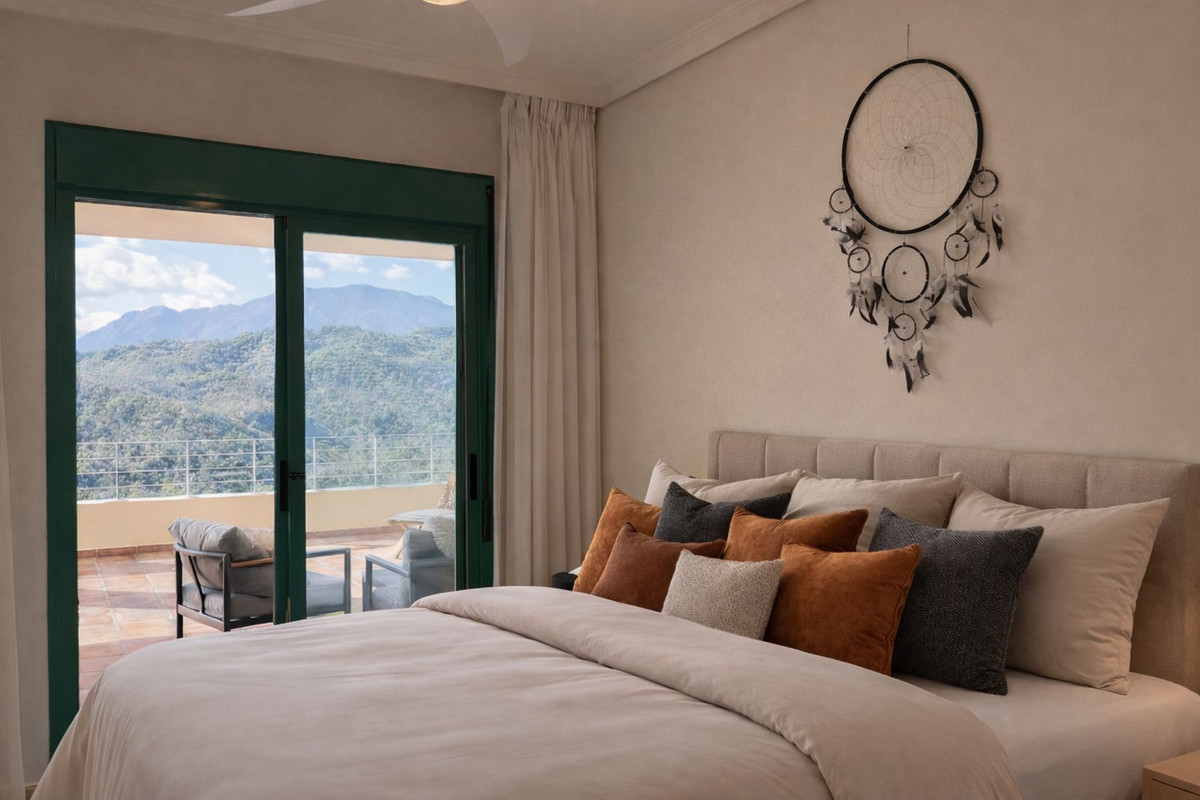 Ce lumineux et spacieux appartement situé au deuxième étage d'une résidence calme et bien entretenue du quartier prisé de Monte Selwo, à l'est d'Estepona, offre une vue panoramique imprenable sur la forêt et les montagnes, ainsi qu'une vue partielle sur la mer. La cuisine est entièrement équipée d'électroménager haut de gamme Neff. L'appartement propose 98 m² de surface habitable et une grande terrasse de 60 m² très privée, exposée sud-ouest, idéale pour admirer le magnifique paysage environnant et de superbes couchers de soleil. Un lieu parfait pour se détendre et contempler la vue. La terrasse est partiellement couverte et partiellement découverte. À l'intérieur, vous trouverez un salon de belle taille, deux chambres (dont une suite parentale avec salle de bains privative), deux salles de bains au total et une cuisine indépendante entièrement équipée. Toutes les pièces, y compris la cuisine, donnent directement sur la grande terrasse. Un système de climatisation réversible est intégré. Le bien comprend également une place de parking souterrain et un cellier d'environ 6 m². Les locations de courte durée sont interdites, ce qui garantit le calme et le caractère résidentiel de la résidence. Les charges de copropriété sont très avantageuses, à seulement 120 € par mois. Le quartier est particulièrement prisé des résidents nordiques et offre un accès facile aux commerces, aux services et aux grands axes routiers. C'est une excellente option comme résidence principale, résidence secondaire ou investissement à long terme. Situé à l'est d'Estepona, il se trouve à environ 14 km de Puerto Banús et à 12 km du centre-ville d'Estepona.