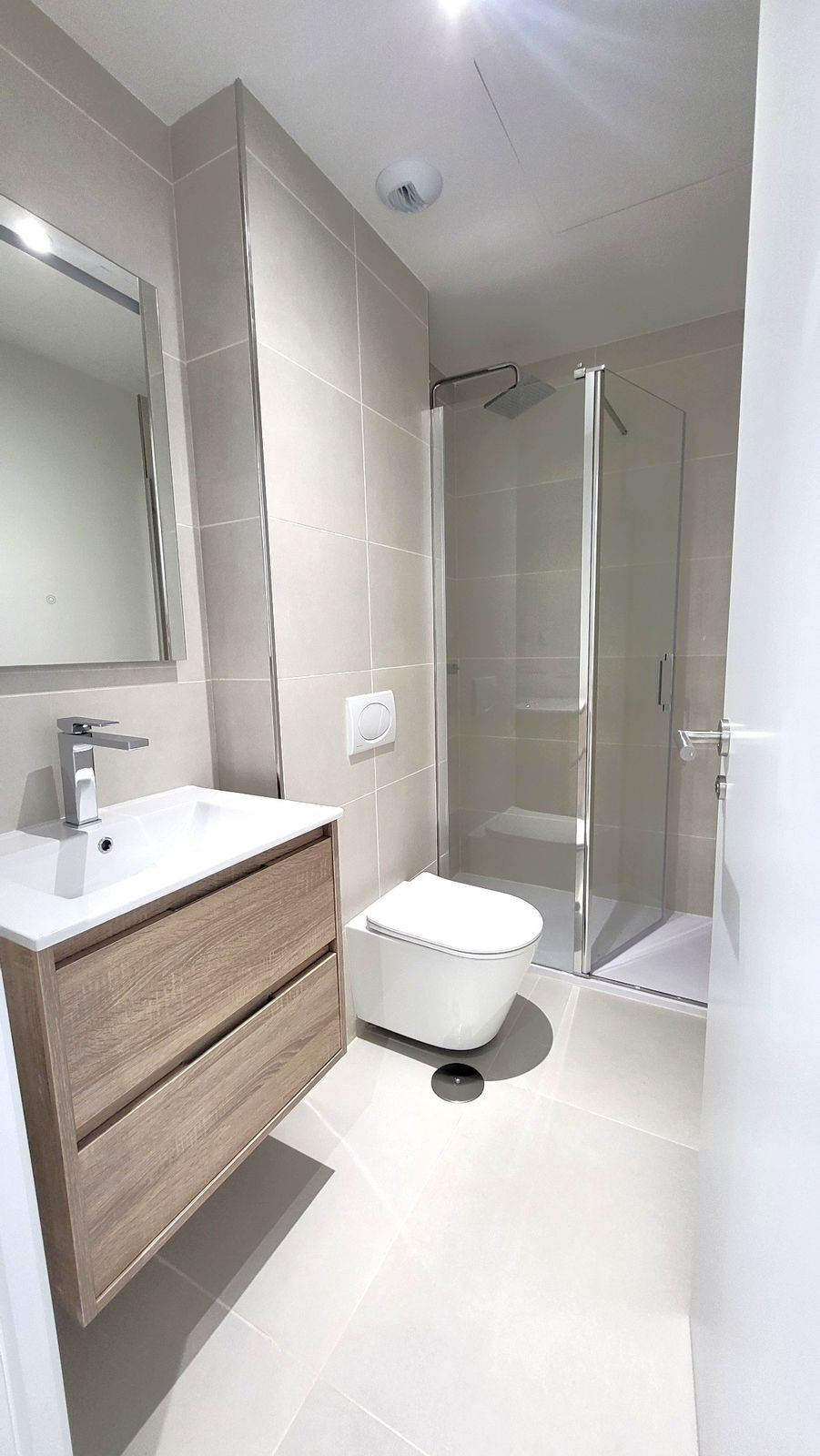 Chambre principale avec salle de bains attenante et accès direct à la terrasse. Climatisation réversible, interphone vidéo, domotique, placards intégrés dans toutes les chambres, chauffage au sol dans les salles de bains, pré-installation pour système d'alarme. Comprend deux places de parking et un débarras.