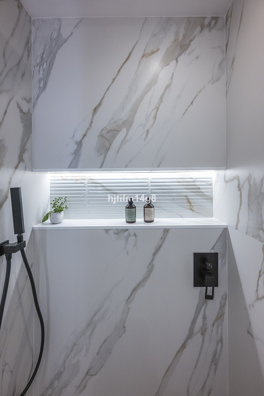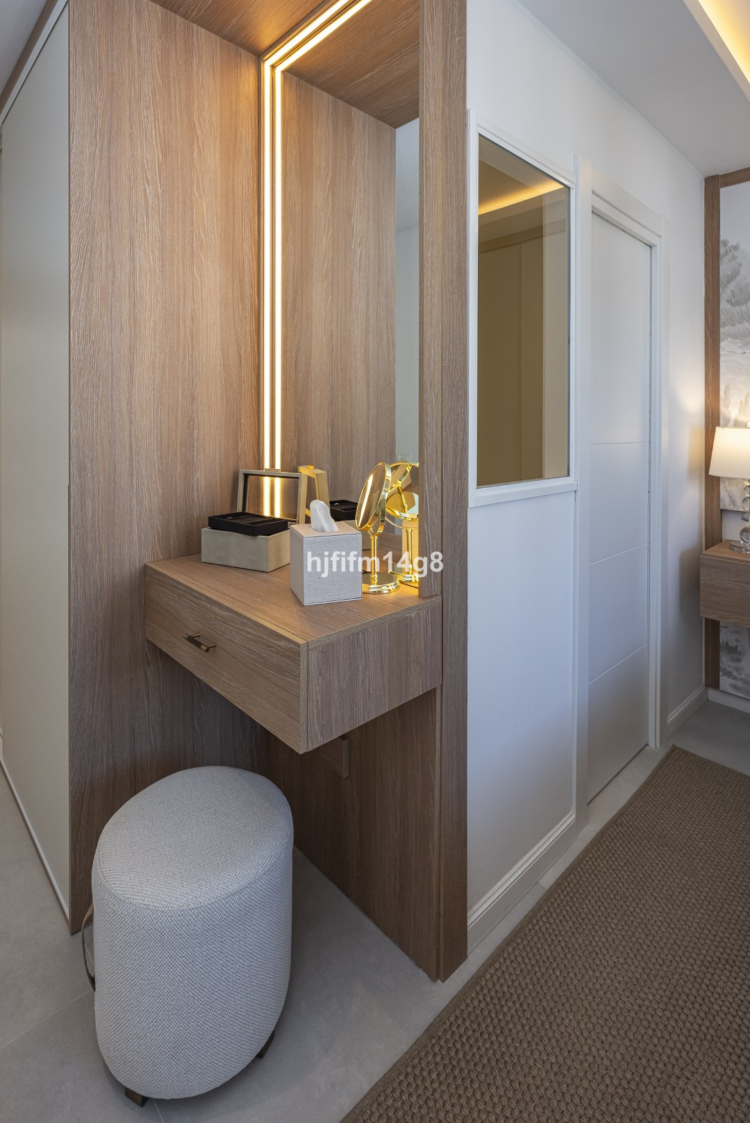 L'étage supérieur abrite une élégante suite parentale avec salle de bains privative et une chambre d'amis également dotée d'une salle de bains privative. Ces espaces comprennent des dressings sur mesure et des meubles de salle de bains personnalisés, avec des finitions raffinées, notamment des tables de chevet en travertin dans la chambre faisant face à la suite parentale. Toutes les salles de bains sont revêtues de carreaux grand format, tandis que les toilettes pour invités arborent de magnifiques carreaux de porcelaine texturée haut de gamme.