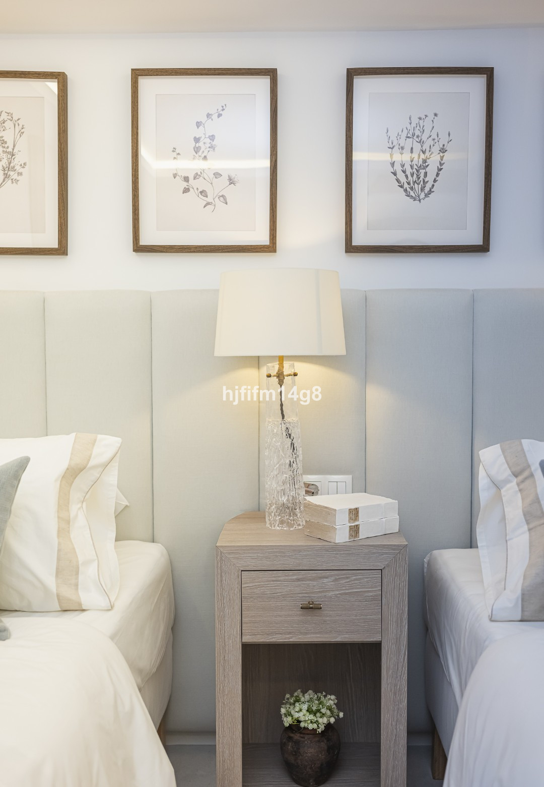 Au niveau inférieur se trouvent une chambre supplémentaire avec salle de bains privative, une autre chambre d'amis, une salle de bains séparée pour les invités et un débarras pratique, offrant ainsi un hébergement flexible pour la famille et les visiteurs. Ce niveau comprend également des éléments de design distinctifs tels qu'un miroir vintage haut de gamme en émail églomisé et des appliques murales artisanales de luxe, conférant à l'espace caractère et raffinement.