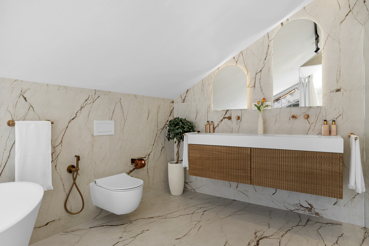 Ce penthouse comprend cinq chambres magnifiquement aménagées, dont une suite parentale spectaculaire à l'étage. Avec ses plafonds mansardés, son vaste dressing, sa salle de bains digne d'un spa et sa terrasse privée offrant une vue imprenable sur la mer et le mont La Concha, c'est un véritable havre de paix. Deux autres chambres disposent chacune d'une salle de bains privative, tandis que deux autres partagent une salle de bains familiale moderne. Une cinquième pièce modulable peut servir de chambre d'amis ou de bureau. Une buanderie séparée avec accès à la terrasse témoigne du soin apporté aux moindres détails pratiques.