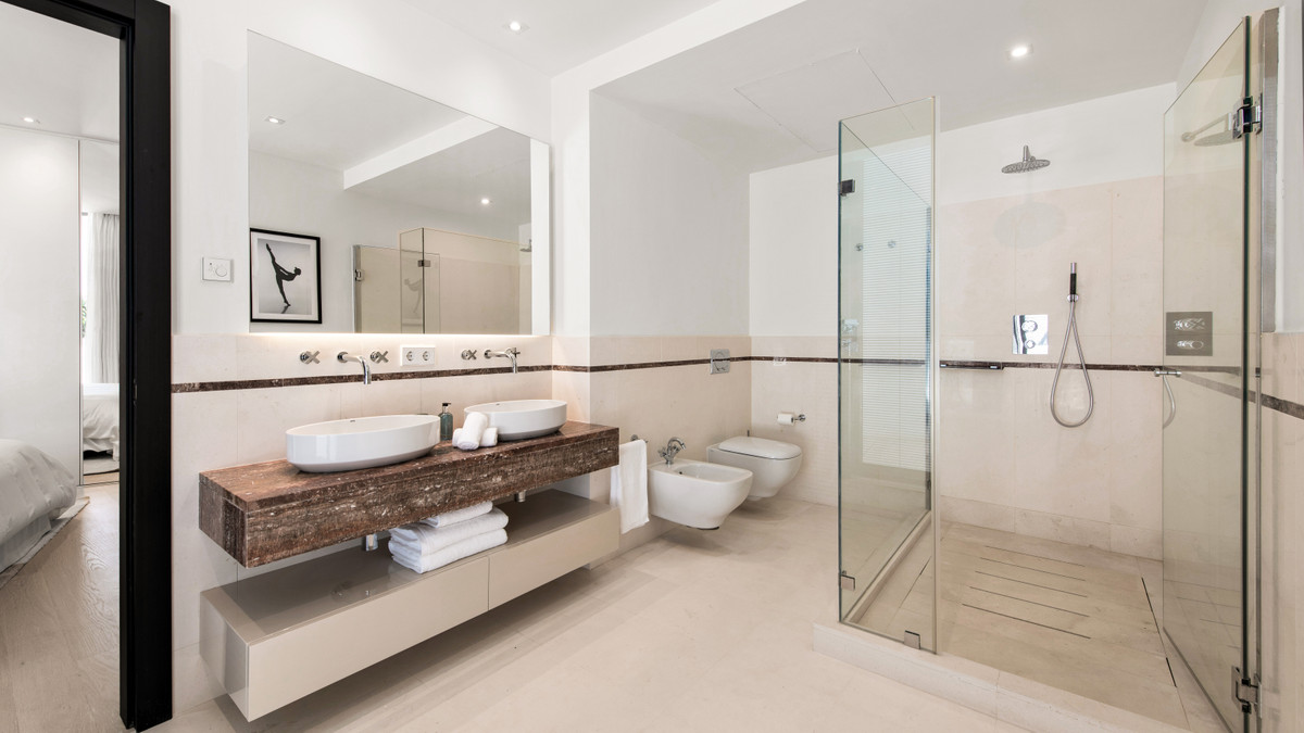 La propriété est répartie sur 4 niveaux reliés par un ascenseur et un escalier ultramoderne. Elle comprend 4 chambres et 4 salles de bains privatives, toutes équipées d'une baignoire hydromassage et d'une douche séparée, ainsi qu'un WC invités, un vaste séjour et une cuisine entièrement équipée en noir et blanc avec îlot central/coin repas et accès à une terrasse pour les repas en plein air.