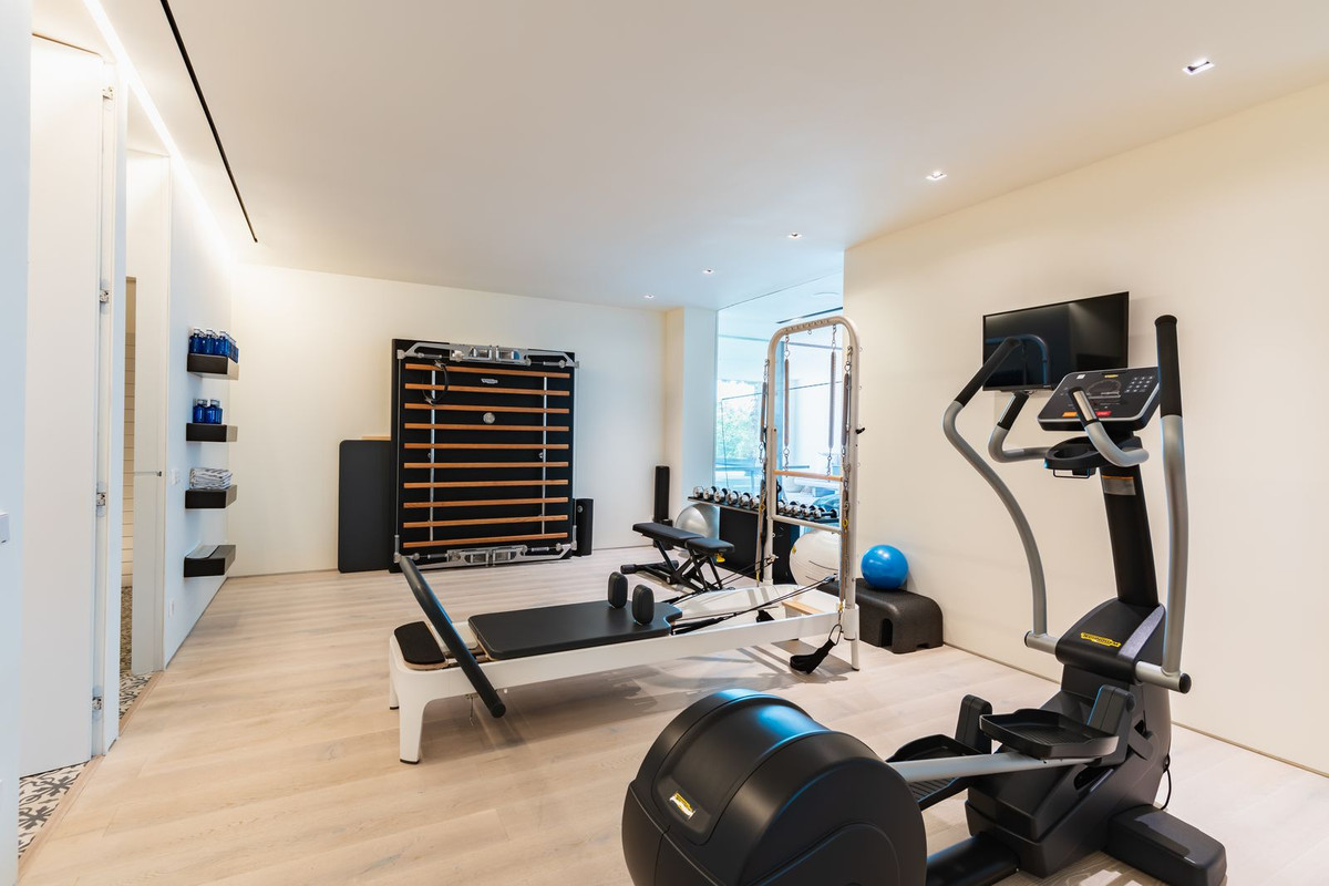 Le niveau inférieur offre une polyvalence exceptionnelle, avec trois chambres supplémentaires (dont une actuellement aménagée en bureau), un vaste espace TV et salon, une salle de sport entièrement équipée et un sauna. Ce niveau s'ouvre sur une terrasse couverte, actuellement utilisée comme salle de jeux, et facilement adaptable à différents besoins. De là, un chemin mène directement à la piscine, elle aussi idéalement située pour profiter pleinement de la magnifique vue sur la côte.