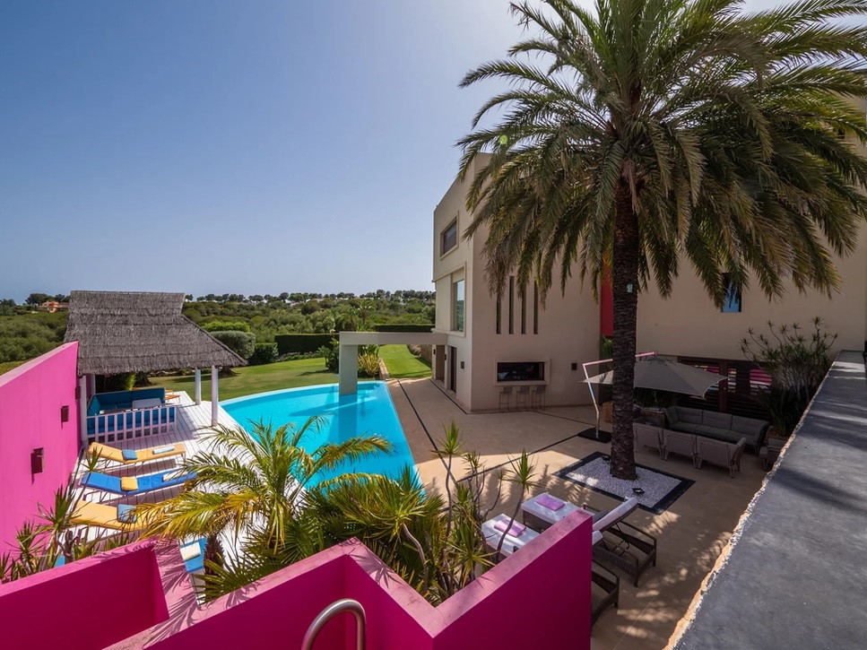 Les pièces principales, décorées avec les plus beaux meubles Georgetti et la cuisine, ont toutes accès à l'extérieur avec certaines zones aux couleurs fortes propres à Barragan. Des murs lumineux accentuent l'espace sur les terrasses près de l'étang de Koi et de l'espace barbecue extérieur protégé du soleil, qui se connecte à un jardin sur deux niveaux avec une fontaine et un mur de couleur vive, protégé du vent et offrant une intimité totale. La piscine à débordement avec sa superbe mosaïque Siccis, sa terrasse en bois IPE et sa cabane de style mexicain. La partie de style la plus spectaculaire de ce manoir est le spacieux espace de vie extérieur avec toit en verre et volets électriques en treillis sculpté qui jouent avec la qualité toujours changeante de la lumière et de l'ombre du toit et de la partie avant séparant le jardin sans enlever la vue sur la mer.