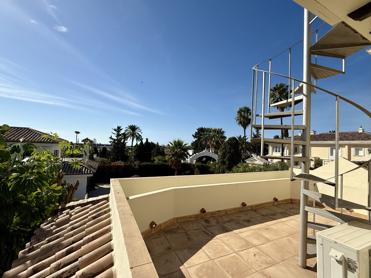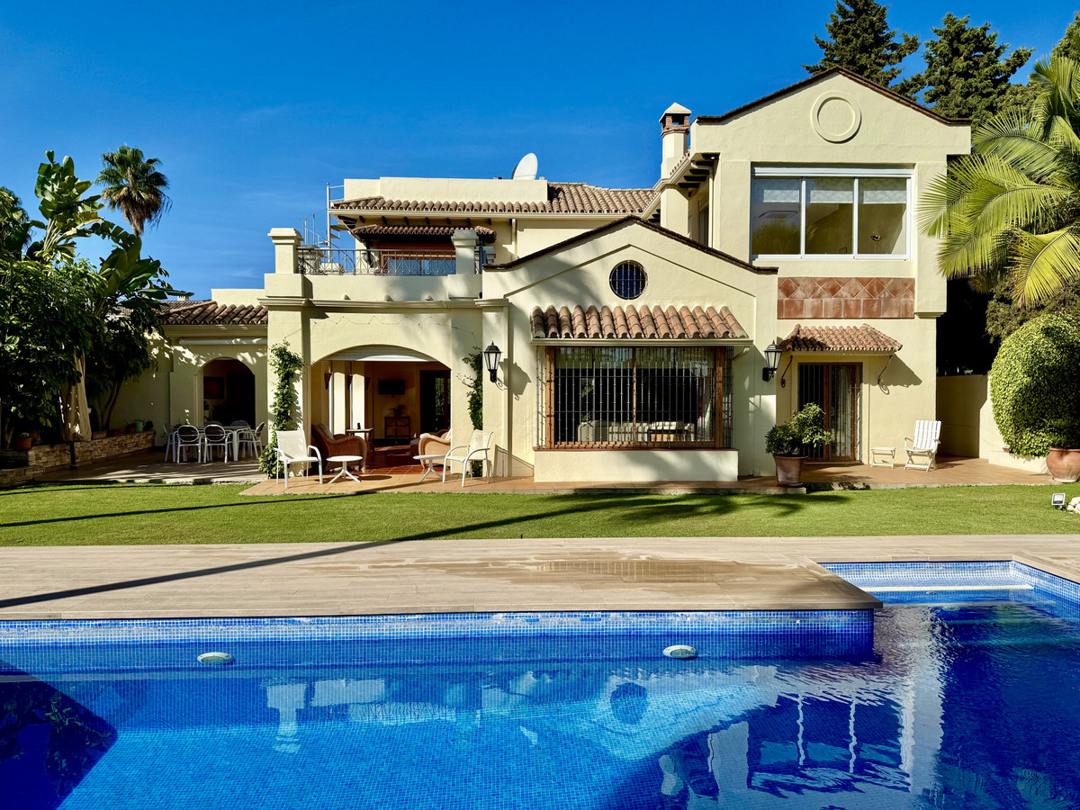Cette superbe propriété est désormais disponible à un prix très compétitif. Son emplacement idéal, à proximité immédiate de plusieurs centres commerciaux, la rend particulièrement attrayante pour ceux qui souhaitent profiter des commodités (restaurants, supermarché, pharmacie, salle de sport, cafés, etc.) sans utiliser leur voiture. La propriété est en excellent état. La villa présente un élégant style andalou. Le hall d'entrée dessert, sur la droite, la salle à manger séparée, la cuisine entièrement équipée et la grande terrasse, couverte et découverte, donnant sur un jardin paysager arboré et très privé avec piscine. Le spacieux salon bénéficie d'une belle hauteur sous plafond avec poutres apparentes. Au même niveau se trouvent deux chambres avec salle de bains privative. Un bel escalier mène au premier étage où se trouvent une grande chambre très lumineuse et la suite parentale avec salle de bains privative et accès à une grande terrasse ensoleillée offrant une vue imprenable sur les montagnes. Au sous-sol, vous trouverez une salle de jeux, une salle de loisirs avec salle de bains et un très grand garage pouvant accueillir plusieurs voitures, ainsi qu'une buanderie. Cette magnifique propriété familiale bénéficie d'un superbe jardin arboré et d'une charmante entrée. Des écoles internationales comme Atalaya et San José in Guadalmina sont à proximité immédiate. La proximité de toutes les commodités, notamment plusieurs terrains de golf tels qu'El Paraiso, Atalaya ou Los Flamingos, la plage à 15 minutes à pied, et le charmant club sportif El Campanario avec sa superbe piscine intérieure, sa salle de sport, son spa et bien plus encore, font de cette maison un lieu de vie familial exceptionnel. Une visite s'impose.