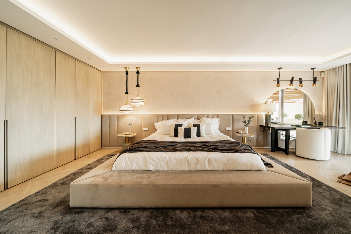 Ce penthouse propose trois chambres spacieuses avec salle de bains privative, chacune décorée dans des tons méditerranéens apaisants, propices à la détente. La suite parentale dispose d'un grand dressing offrant un espace de rangement généreux et un confort luxueux.