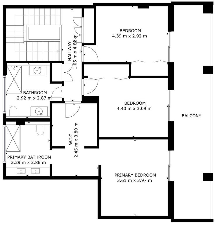 Master Suite: A large, private retreat featuring a walk-in wardrobe, large windows, and direct access to the terrace.