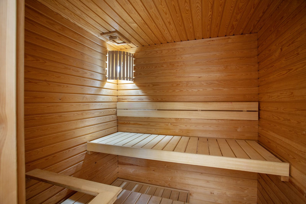 The master suite features separate dressing rooms, a spacious en-suite bathroom with a whirlpool tub and private sauna, creating an ideal space for relaxation and well-being.