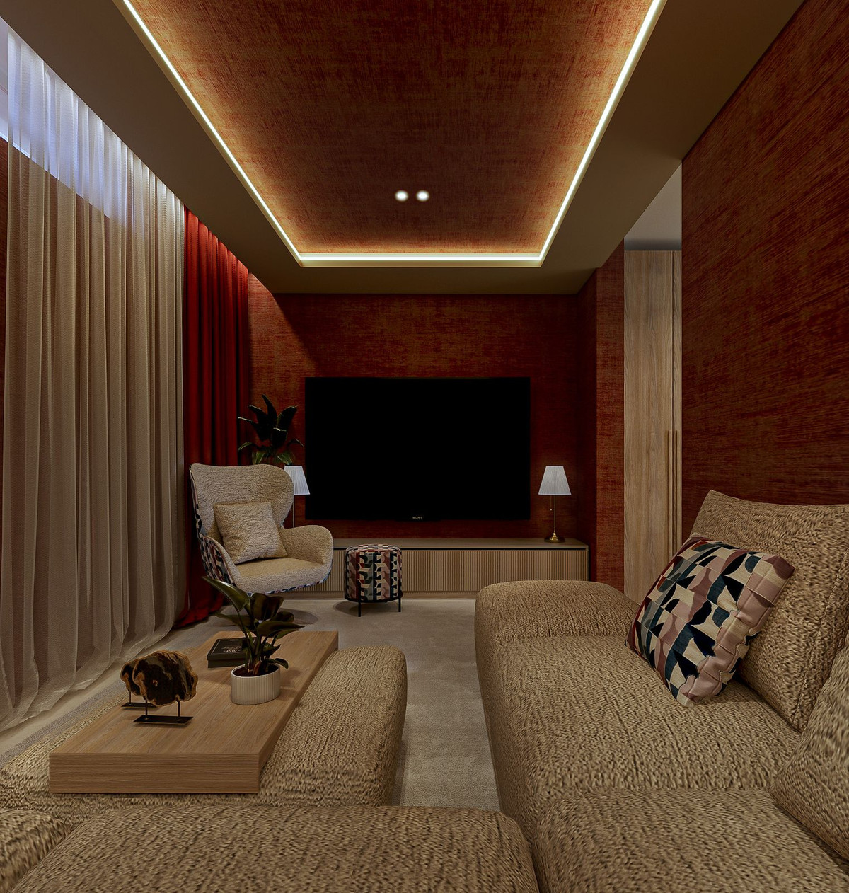 L'une des chambres est actuellement aménagée en salle de cinéma et de jeux intimiste, équipée d'un grand écran de télévision, d'un système audio et d'un éclairage LED d'ambiance. Elle peut facilement être transformée en une cinquième chambre avec salle de bains privative. L'éclairage a été soigneusement pensé : la plupart des plafonniers et des luminaires d'ambiance sont équipés de variateurs afin de créer des atmosphères modulables dans toute la maison.