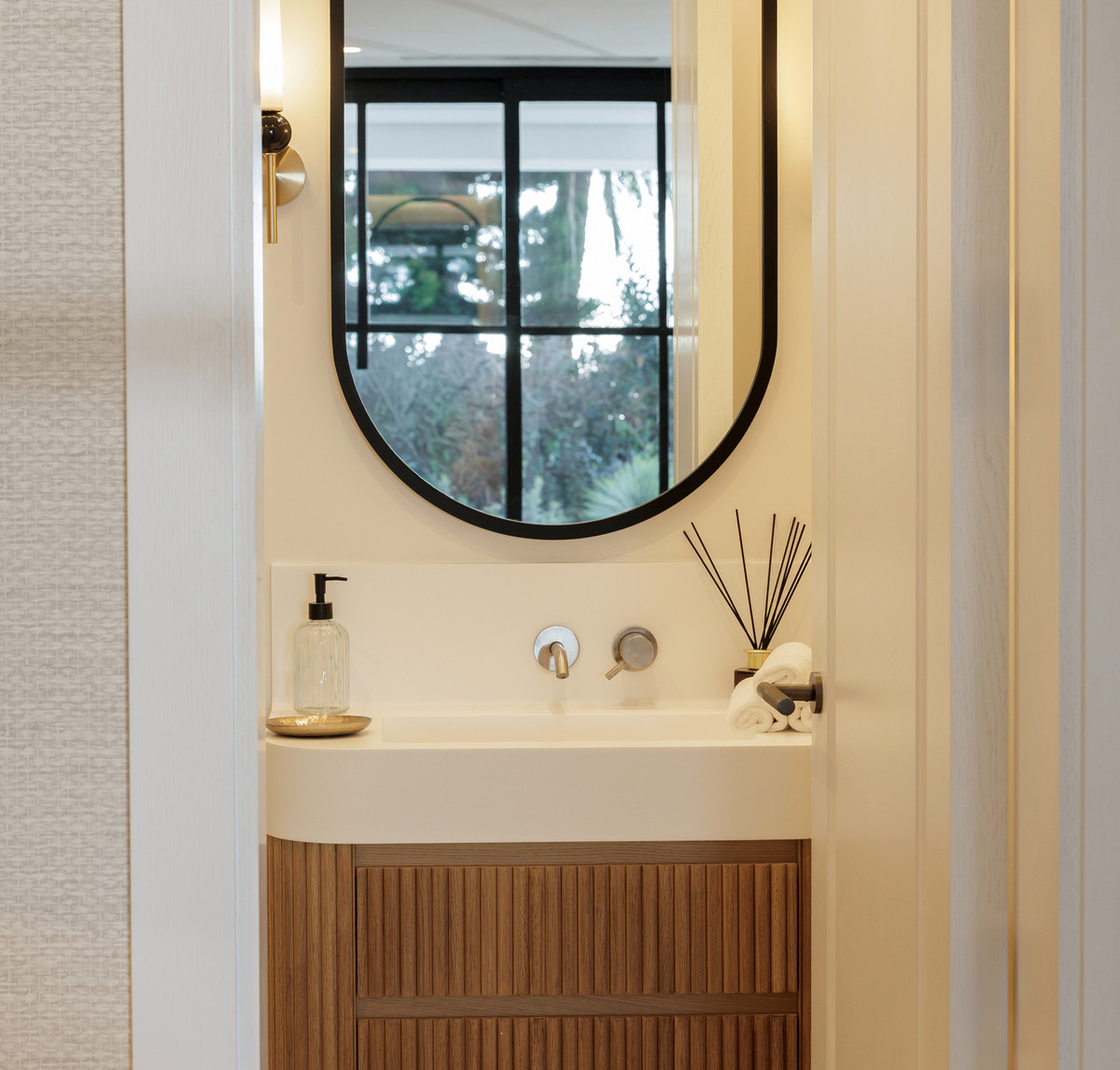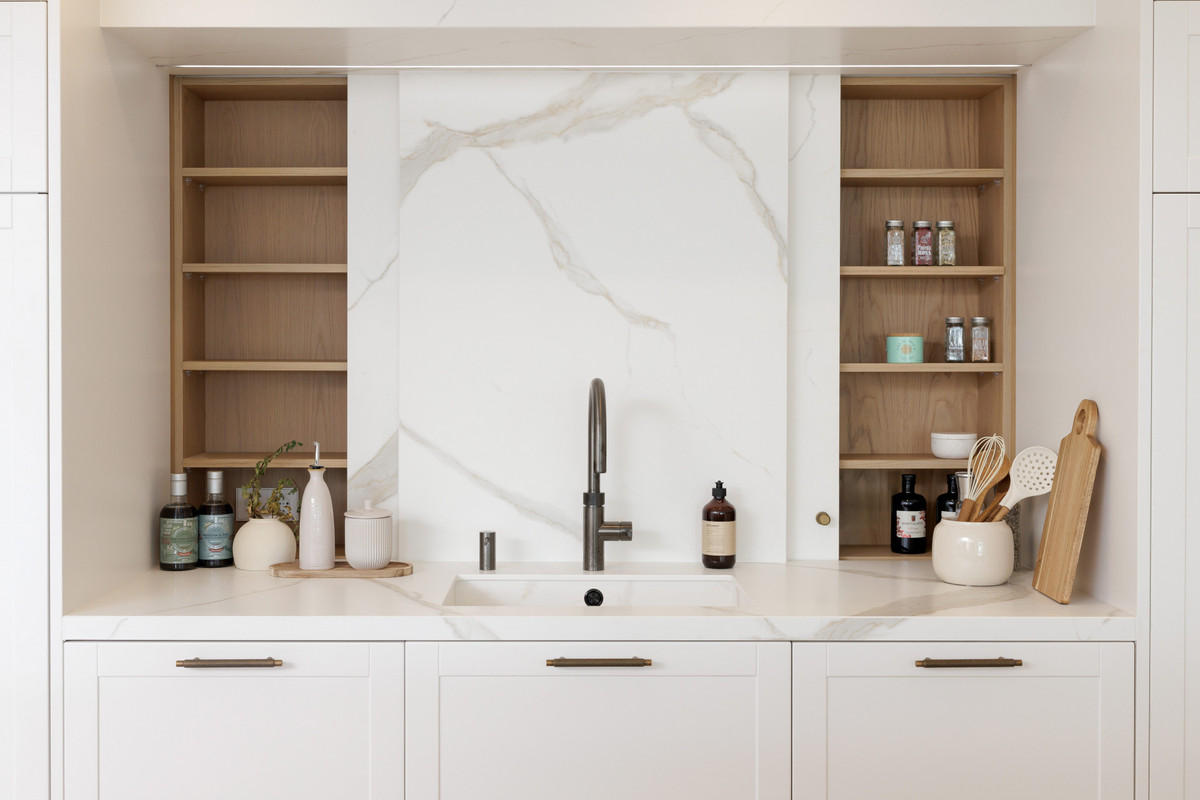 La cuisine est un atout majeur de la propriété. Conçue avec des lignes épurées et des matériaux haut de gamme, elle comprend un grand îlot central, des appareils électroménagers intégrés et de nombreux rangements dissimulés dans des placards sur mesure. Son agencement favorise la convivialité, avec une vue directe sur le salon et un accès aisé aux terrasses extérieures et à la piscine. Cette combinaison d'agencement et de design fait du rez-de-chaussée l'un des points forts de la maison.