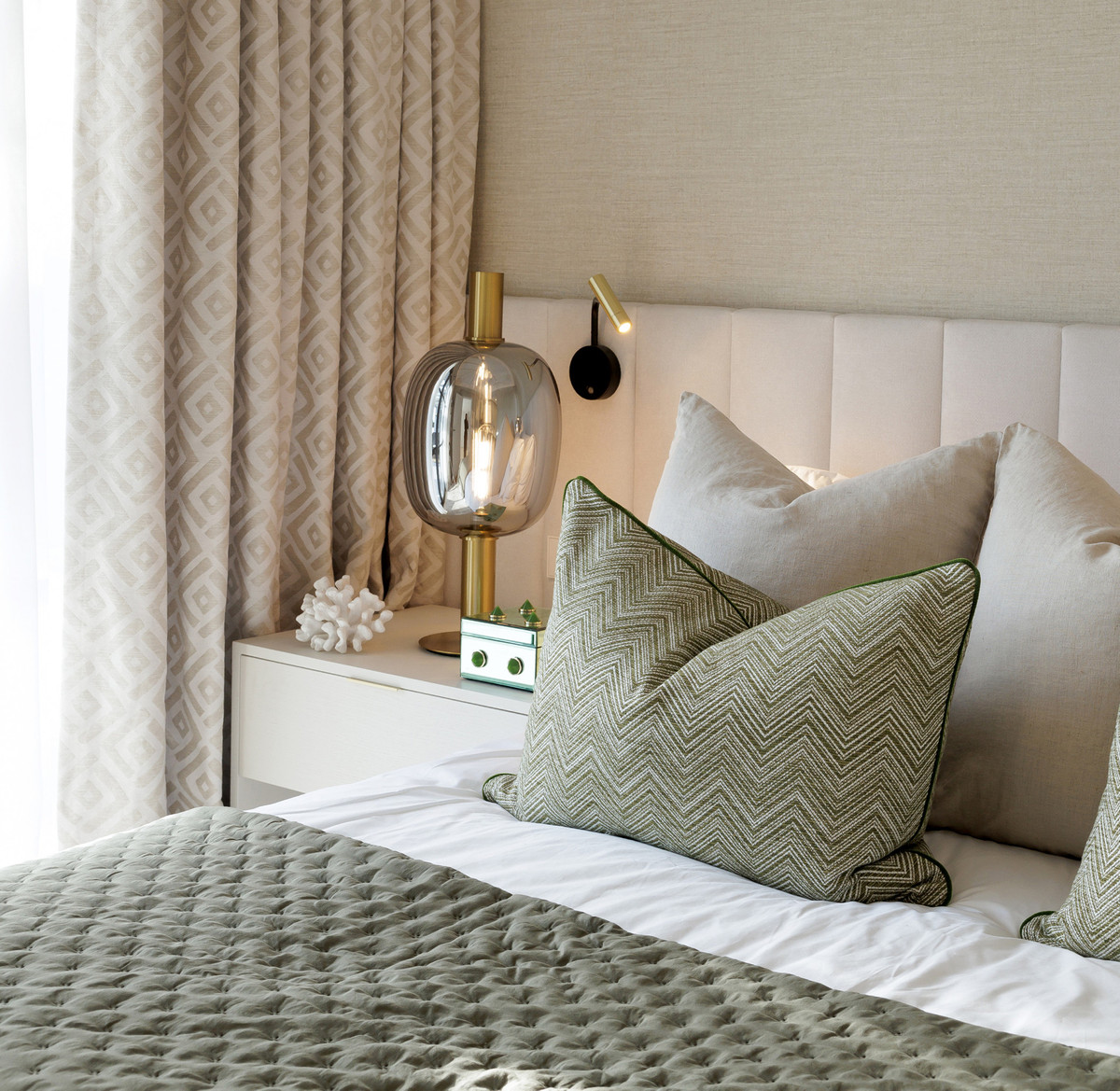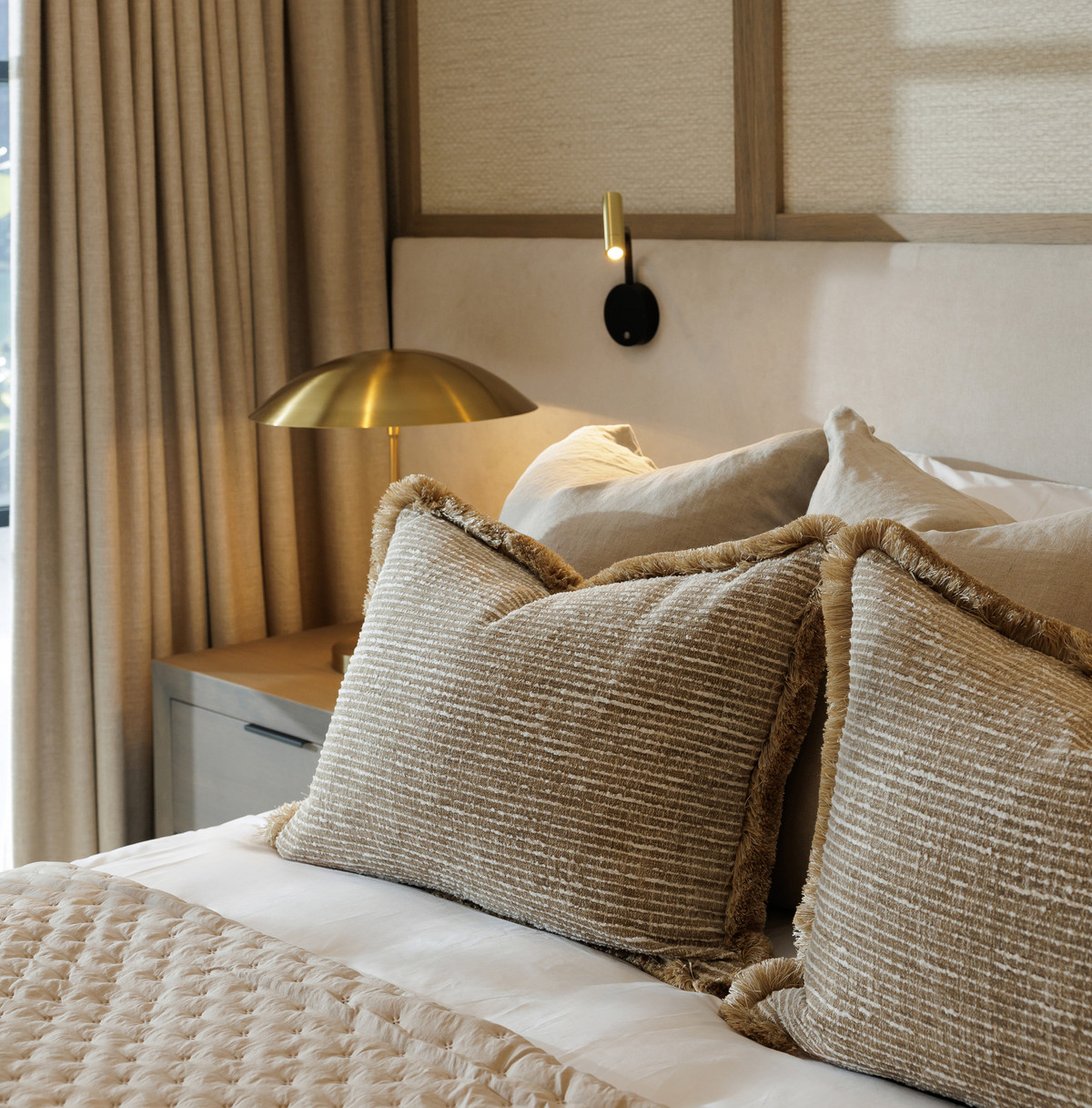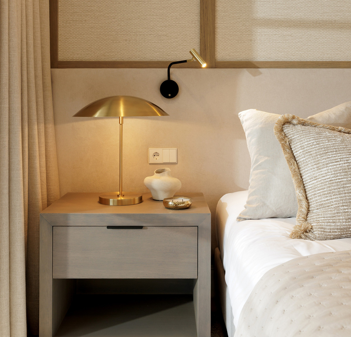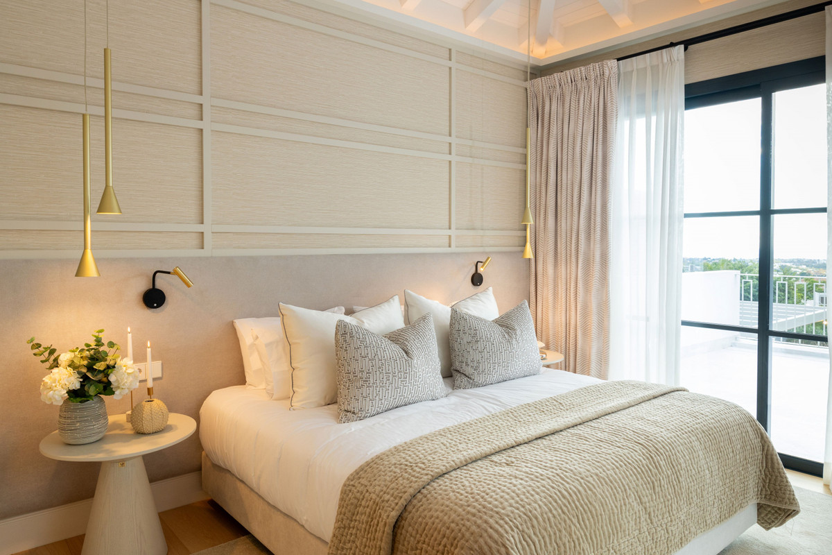 La propriété comprend cinq chambres élégantes, dont une suite parentale privative à l'étage avec accès direct à une terrasse. Chaque chambre arbore le même style : tons neutres, menuiseries sur mesure et éclairage soigné. L'étage supérieur s'ouvre également sur de vastes espaces extérieurs offrant une vue imprenable sur le littoral.