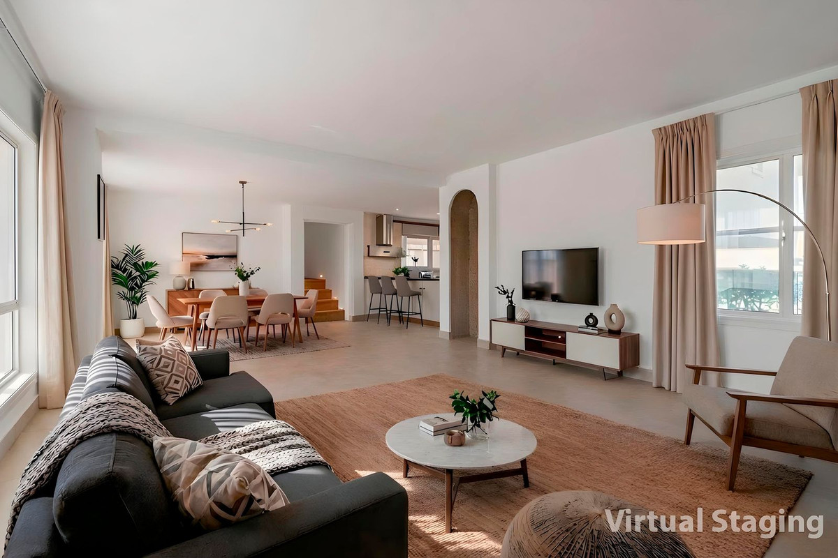 Le hall d'entrée, inspiré du style andalou classique, s'ouvre sur le salon principal, un espace lumineux et accueillant donnant directement sur une vaste terrasse. On peut s'y imaginer savourer des petits déjeuners en famille tout en admirant la vue imprenable sur la mer. Avec son sol en marbre, sa cheminée et sa climatisation, ce salon devient le cœur de la maison et le cadre idéal pour des moments inoubliables.