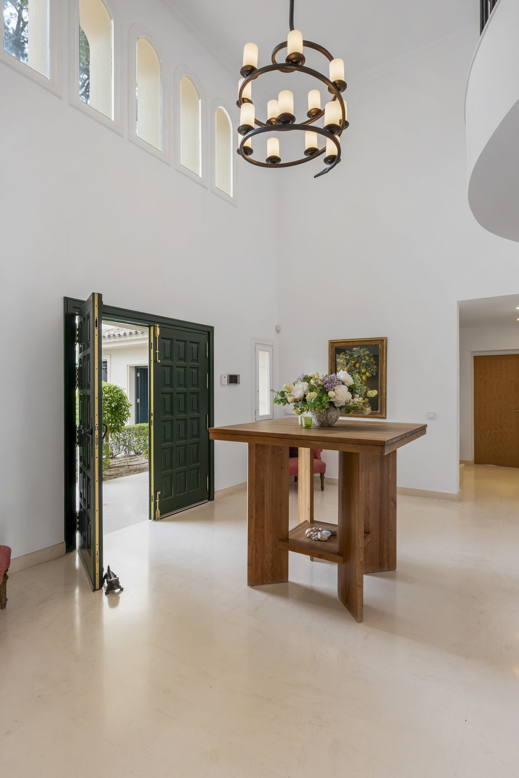 En entrant, vous êtes accueilli par un hall d'entrée à double volume qui mène à une spacieuse cuisine ouverte et un salon formel, tous deux s'ouvrant sur un patio couvert avec accès aux jardins et à la piscine. Le rez-de-chaussée comprend également une salle à manger formelle, une buanderie séparée, une salle de bains de service et de nombreux espaces de rangement. Dans l'aile droite, se trouvent une très grande chambre principale avec dressing, salle de bains en suite et accès direct aux jardins et à la piscine, un bureau privé, ainsi qu'une suite privée supplémentaire avec une chambre et salle de bains. salle de bains privative.