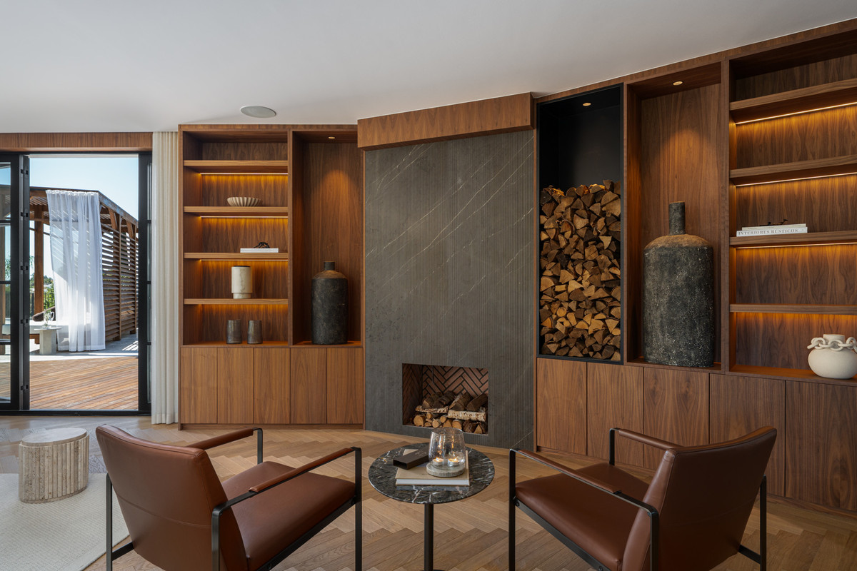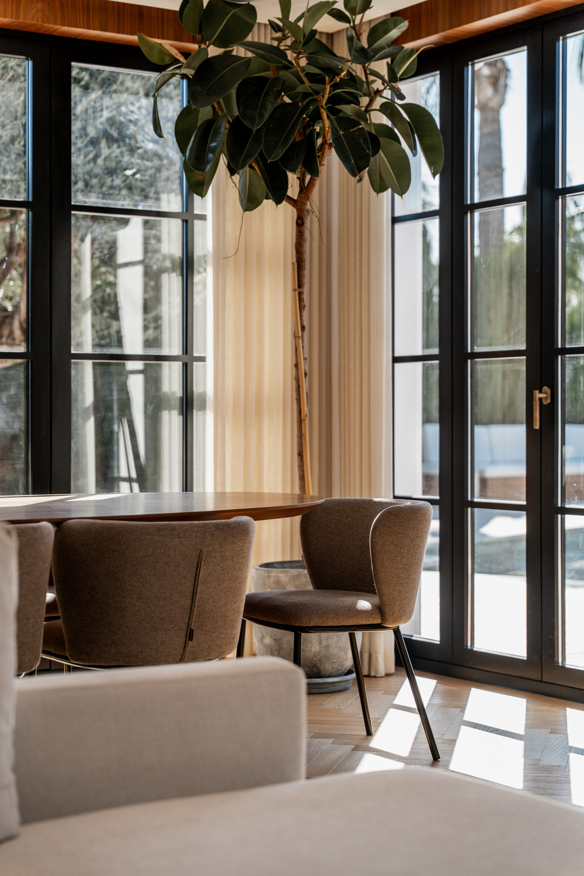 Cette villa de Golf Valley est unique en son genre. Repensée selon une vision architecturale affirmée, elle accorde une attention particulière aux proportions, aux matériaux et à la circulation. Dès l'entrée, le souci du détail saute aux yeux : parquet en chêne à chevrons, menuiseries sur mesure en noyer, meubles cannelés et marbre veiné foncé, le tout harmonieusement agencé plutôt que par un contraste ostentatoire.