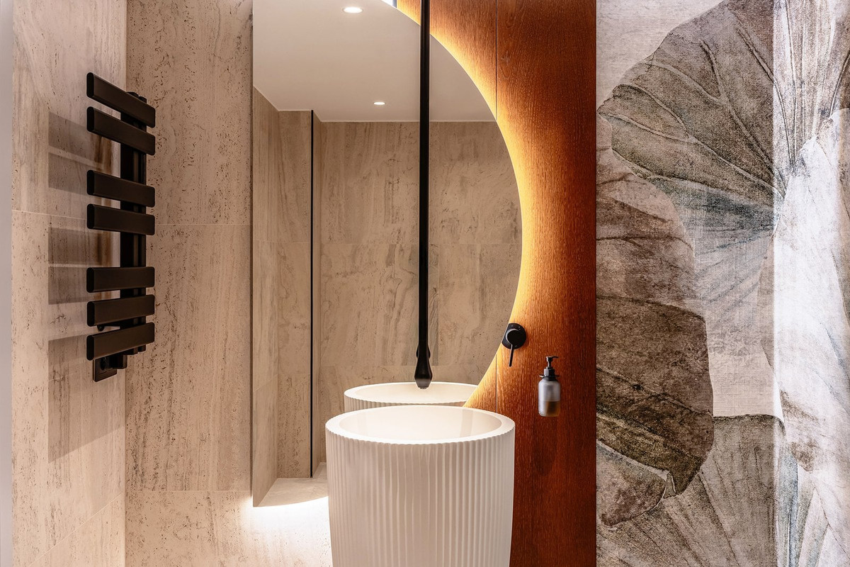 Au cœur de la maison se trouve un espace de vie soigneusement conçu, où la lumière naturelle et des matériaux de choix créent une atmosphère élégante et apaisante. La cuisine sur mesure, équipée d'appareils Gaggenau, s'intègre harmonieusement aux espaces salle à manger et salon, idéale pour le quotidien comme pour recevoir.