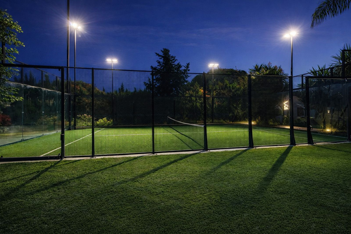 À l'extérieur, la propriété s'ouvre véritablement sur l'extérieur. Le terrain offre une combinaison rare de surface plane exploitable, d'aménagements paysagers matures et de prestations haut de gamme, notamment une piscine à débordement, un court de paddle-tennis flambant neuf, une grande terrasse avec barbecue et espace de divertissement, ainsi qu'une cuisine équipée attenante au barbecue et de multiples espaces pour bronzer, se détendre à l'ombre, dîner et se relaxer. Sous l'espace barbecue se trouvent une salle de sport avec sauna et jacuzzi, ainsi que des vestiaires, qui nécessitent actuellement quelques travaux de rénovation.